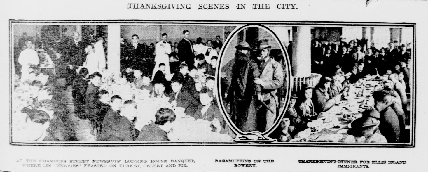The man stayed in the restaurant until the boys had feasted to their hearts’ content and the orders that were filled for pork and beans, “sinkers,” mince pie and coffee kept the waiters busy. Every now and then a new lot of boys gathered in front of the beanery, and they, too, were called inside and feasted by Petey’s Santa Claus. The latter did not leave until there were no more boys to fee, and when he finally went away he left a bright silver dollar in Petey’s hand, and the latter and his chum slept in warm beds in the Newsboys’ Lodging House that night.
